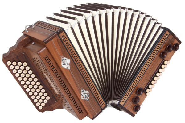 Dieses Modell aus heimischem Nussholz besticht mit seiner gemaserten Eigenstruktur, dank der jede Harmonika zum Einzelstück wird.